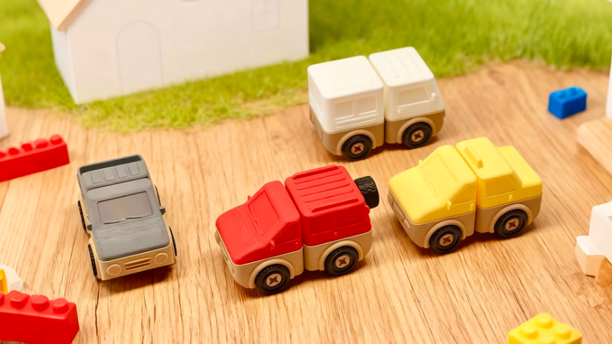 Bouwbare 3D-geprinte BlokAuto's. Kinderen kunnen vrij combineren tot elk voertuig dat ze zich voorstellen, in plaats van beperkt te zijn tot één vaste speelgoedauto.